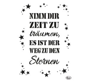 Niedliche Schablone „“Nimm dir Zeit““ im A3 Format. Eine schöne, mehrfach verwendbare Schablone mit dem tollen Spruch „“Nimm dir Zeit zu träumen, es ist der Weg zu den Sternen.““ Eine tolle Schablone, um zum Beispiel Dekorationen im Eingangsbereich, der Küche oder dem Wohnzimmer zu gestalten. Für ein noch besseres Ergebnis beim Schablonieren können Sie die Schablone mit einem Schablonen-Kleber oder einem Haft-Spray verwenden, um die Schablone am Wegrutschen zu hindern. Anschließend können Sie die Schablone ganz einfach wieder von Ihrem Untergrund entfernen und Ihr Kunstwerk noch mit zum Beispiel Glitzer versehen. DIN Format A3 Material: Polyethylentherephthalat (PET)