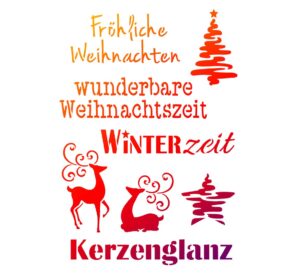 Der Allrounder zur Weihnachtszeit unsere Schablone „Weihnachtsmotive + Schriften“. Die Schablone im DIN A4 Format ist für alle Schablonier-Techniken geeignet. Niedliche Einkaufstaschen oder Geschenksäckchen zur Weihnachtszeit, können ab sofort selbst gestaltet werden. Die verschiedenen Schriften und die niedlichen Motive laden zum Kreativsein ein und machen die Adventszeit zur Kreativzeit. Egal ob Sie Sprayen, Stupfen, Ausmalen, Kleben und Bestreuen oder Modellieren, diese Universalschablone ist hervorragend für weihnachtliche Dekorationen auf vielen verschiedenen Materialien geeignet. Anwendungs-Tip: Untergrund vorbereiten ggf. reinigen Schablone auf der gewünschten Fläche fixieren (wir empfehlen wiederablösbares Fixierspray, dies auf die Rückseite der Schablone sprühen) Motive nach eigenen Wünschen Kolorieren Kurz antrocknen lassen Schablone entfernen solange die Farbe noch etwas feucht ist und danach durchtrocknen lassen DIN Format A4 Material: Kunststoff