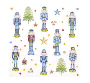 Mit der Serviette „“Nutcrackers““ bringst du eine festliche Stimmung in deine Bastelwerke. Das Motiv mit Nussknackern, Tannenbäumen und Sternen ist perfekt für die Serviettentechnik in der Weihnachtszeit. Mit dem halben Motiv ist es einfach, das Design auf verschiedene Untergründe wie Holz, Pappe, Karton oder Stoff zu übertragen. Auch Kerzen, Laternen oder Vasen lassen sich wunderbar mit der Serviettentechnik gestalten. Lass dich von der Magie der Weihnachtszeit inspirieren und gestalte einzigartige Dekorationen mit der Serviette „“Nutcrackers““! Erfahre alles über die kreativen Gestaltungsmöglichkeiten rund um das Thema Serviettentechnik und entdecke weitere tolle Serviettenmotive, Rohlinge und Zubehör. Motiveinteilung halbes Motiv Inhalt: 20 Stück Länge: 33 cm Breite: 33 cm Material: Papier
