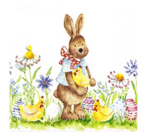 Osterhase Max und seine fröhlichen Hühner begleiten dich auf deiner kreativen Reise durch das Osterfest. Mit der Serviette „“Osterhase Max““ kannst du verschiedene DIY-Projekte gestalten und deinen eigenen Osterhasen im Bastelfieber zum Leben erwecken. Die einseitig bedruckte Serviette zeigt das zauberhafte Motiv von Max und drei Hühnern, umgeben von bunten Ostereiern und frühlingshaften Blumen. Die Rückseite ist Weiß und bietet somit viel Gestaltungsspielraum für deine Ideen. Mit einer Breite von 33 cm und einer Länge von 33 cm eignet sich die Serviette ideal für die Serviettentechnik. Mit dieser beliebten Technik kannst du das Motiv mithilfe von Serviettenlack auf verschiedenste Untergründe wie zum Beispiel Holz, Pappe, Karton oder sogar Stoff übertragen. Verwende hierfür einfach den Decoupage-Kleber zum Aufkleben und versiegle dein Werk anschließend mit dem Decoupage-Lack für ein langanhaltendes Ergebnis. Die Serviette „“Osterhase Max““ ist Teil unseres vielfältigen Serviettensortiments und eignet sich perfekt für die Gestaltung von Osterdekorationen, Tischdekorationen oder Grußkarten. Kreiere dein ganz persönliches Osternest, beklebe Ostereier oder gestalte eine frühlingshafte Collage mit der charmanten Serviette. Bestelle jetzt die Serviette „“Osterhase Max““ und zaubere fröhliche Osterstimmung in dein Zuhause! Erfahre alles über die kreativen Gestaltungsmöglichkeiten rund um das Thema Serviettentechnik und entdecke weitere tolle Serviettenmotive, Rohlinge und Zubehör. Motiveinteilung viertel Motiv Inhalt: 20 Stück Länge: 33 cm Breite: 33 cm