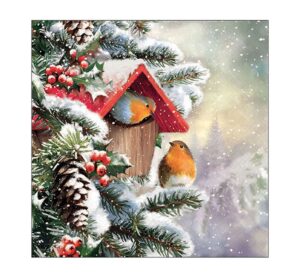 Mit dieser Serviette „“Rotkehlchen Winterhaus““ bringst du ein stimmungsvolles Motiv in deine Bastelprojekte! Sie zeigt ein gemütliches Vogelhaus mit zwei Rotkehlchen, umgeben von einer Tanne und Mistelzweigen. Mit der Serviettentechnik kannst du das Motiv auf verschiedenen Untergründen wie Holz, Pappe, Karton oder Stoff übertragen. Du könntest zum Beispiel eine winterliche Holzschatulle oder ein weihnachtliches Tablett damit gestalten. Mit ihrem viertel Motivformat und dem einseitigen Druck eignet sie sich perfekt für deine Winter- und Weihnachtsbasteleien. Gestalte wunderschöne Dekorationen für dein Zuhause. Sichere dir jetzt die Serviette „“Rotkehlchen Winterhaus““! Erfahre alles über die kreativen Gestaltungsmöglichkeiten rund um das Thema Serviettentechnik und entdecke weitere tolle Serviettenmotive, Rohlinge und Zubehör. Motiveinteilung viertel Motiv Inhalt: 20 Stück Länge: 33 cm Breite: 33 cm Material: Papier