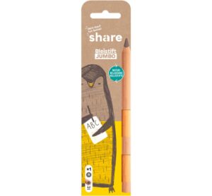 Mit dem share Bleistift Jumbo B wird Schreiben lernen zum Kinderspiel – und das auch noch mit gutem Gewissen. Denn für jeden Kauf eines dieser dreikantförmigen Bleistifte spendet share eine Unterrichtsstunde. Doch das ist nicht der einzige Grund, warum dieser Bleistift ein einzigartiges Produkt ist. Der Jumbo Bleistift ist speziell für Schreibanfänger:innen konzipiert und bietet durch seine weiche Mine mit dem Härtegrad B eine optimale Schreibunterstützung. Dank seines dreikantigen Designs liegt er besonders gut in kleinen Kinderhänden und ermöglicht somit eine entspannte Schreiberfahrung. Das Geschriebene lässt sich zudem mühelos wieder wegradieren, sodass Fehler schnell korrigiert werden können. Das besondere an dem share Bleistift Jumbo:Hülle des Bleistifts besteht aus naturbelassenem Holz ohne Lacke hergestellt Markenprodukt aus Deutschland bruchfeste Mine mit einem Ø von 4,3 mm Dieser Schreiblernstift ist nicht nur ein praktisches Hilfsmittel für Schulkinder, sondern auch eine tolle Ergänzung für die Stiftesammlung. Die Möglichkeiten für die Verwendung dieses Bleistifts sind schier unendlich – sei es für das Skizzieren, Zeichnen oder Schreiben auf unterschiedlichen Papieren. Also worauf wartest du noch? Hol dir jetzt deinen share Bleistift Jumbo B und werde Teil der Mission, Schreiben zu einem nachhaltigen Erlebnis zu machen. Geeignet für Kinder