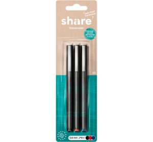Mit jedem Kauf eines share Tintenroller-Sets tust du nicht nur dir selbst etwas Gutes, sondern unterstützt auch noch einen guten Zweck! Denn für jede verkaufte Schreibware wird eine Unterrichtsstunde gespendet und so tragen wir gemeinsam zu einer besseren Bildung für alle bei. Die drei Roller in den Farben Schwarz, Rot und Blau sind nicht nur praktisch, sondern auch umweltschonend. Mit einer Strichstärke von 0,6 mm ermöglichen sie komfortables und flüssiges Schreiben. Und auch wenn sie mal ein paar Tage offen liegen, trocknen sie nicht aus. Dank der geruchsneutralen, wasserbasierten Tinte sind sie auch für empfindliche Nasen geeignet. Weitere überzeugende Merkmale:Gehäuse des Tintenrollers besteht zu mindestens 85 % aus recyceltem Plastik Verpackung besteht aus 100 % Recyclingmaterial Hochwertiges Markenprodukt, hergestellt in Deutschland Lass dich von der Qualität und dem nachhaltigen Konzept des share Tintenrollers überzeugen und tue gleichzeitig etwas Gutes. Bestelle jetzt dein 3er-Set und mache deine Kreativität sichtbar! Strichstärke: 0.6 mm Inhalt: 3 Stück