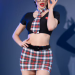 Sexy Schoolgirl Set CR4453 von Chilirose kariertes Outfit mit Netzärmeln, Kunstlederdetails, Strumpfhaltern und Brille für provokante Rollenspiele – Sexy Kostüm