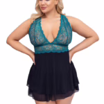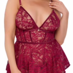 Elegantes Cottelli CURVES Set: Strapshemd in Dunkellila mit Spitze und offener String für unwiderstehlichen Tragekomfort – Strapshemd & String ouvert im Set