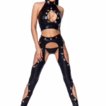Schwarzes Wetlook-Set 18252 mit Cropped Top, Cutouts, Metallringen und Leggings heißer Style in elastischer SARESIA-Qualität