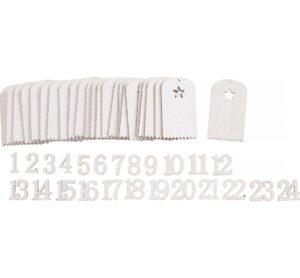 Mit diesen VBS Adventsschildern mit Zahlen 1-24 „“Stanton““ können Sie so richtig kreativ werden. Aus den 24 Schildern mit einer Größe von ca. 6 x 3,5 cm und den 24 Zahlen mit einer Höhe von ca. 2 cm und einer Breite von ca. 0,7 – 2,3 cm lassen sich individuelle Adventszahlen für selbstgemachte Adventskalender basteln. Die Holzteile haben eine Stärke von ca. 1,5 mm und die Öse der Schilder hat einen Ø von ca. 2 mm. So lassen sich die Zahlen mithilfe einer Schnur oder Kordel befestigen. Wer freut sich nicht über einen selbstgemachten Adventskalender, um die Vorweihnachtszeit zu verkürzen? Mithilfe dieser Adventsschilder wird der Kalender besonders individuell. Alle Holzteile sind einseitig Weiß grundiert. Mit ein wenig Heißkleber können die Zahlen ganz nach eigenen Vorstellungen auf den Schildern platziert werden. Nun noch ein wenig mit Bastelfarben, Glitter, Motivstrohseide und passendem Schleifenband verzieren und schon sind die Anhänger fertig. Perfekt, um befüllte Papiertüten, Organzasäckchen oder kleine Jutebeutel liebevoll zu gestalten. Anzahl Teile: 48 Material: Sperrholz Stärke: 1.5 mm