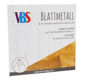 Mit dem hochwertigen VBS Blattmetall in der XXL Packung mit 40 Blatt, veredeln Sie alltägliche Dinge und setzten glänzende Akzente auf ihren Kreativ-Ideen. Die leicht zu verarbeitende Silber- und Goldfolie lässt sich mit Hilfe von Anlegemilch und Pinsel auftragen und veredelt so Keilrahmen, Holz, Terrakotta, Glas u.v.m. in Blattgold bzw. Blattsilber-Optik. Inhalt: 40 Stück Länge: 14 cm Breite: 14 cm Material: Kupfer, Zink