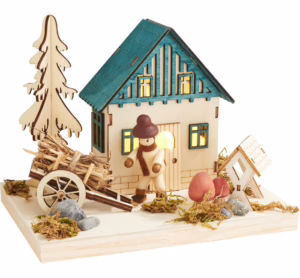 Entdecke die zauberhafte Welt der VBS Holzhaus-Szene „“Licht““ und verwandle dein Zuhause in eine stimmungsvolle Winterlandschaft. Diese liebevoll gestaltete Holz-Dekoration besteht aus Sperrholz und Naturmaterialien wie Moos, Steinen und Stroh. Mit einer Größe von 13 x 14,5 x 18 cm fügt sich die Szene perfekt in jedes Ambiente ein. Die eingebaute LED-Beleuchtung, betrieben mit 2x AAA-Batterien (nicht im Lieferumfang enthalten), taucht die Szene in ein warmes, einladendes Licht. Gestalte mit dieser Miniaturszene deinen eigenen magischen Winterwald. Die farbigen Elemente verleihen der Szenerie zusätzliche Lebendigkeit. Ob als Blickfang auf dem Tisch, im Regal oder als Teil einer größeren Dekoration – die VBS Holzhaus-Szene „“Licht““ zieht alle Blicke auf sich. Lass deiner Kreativität freien Lauf und kreiere einzigartige Arrangements, die deine Gäste verzaubern werden. Bestelle jetzt und bringe winterlichen Charme in dein Zuhause! Länge: 18 cm Breite: 13 cm Höhe: 14.5 cm Material: Sperrholz, Moos