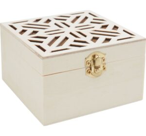 VBS Holzkästchen „“Ornament““ mit einer Größe von ca. 10 x 10 x 6 cm. Innenmaß ca. 9 x 9 x 4 cm, Deckel-Innenmaß 9 x 9 x 1,4 cm. Das Material ist hochwertiges Sperrholz mit einem wunderschön gearbeiteten Blumenornament im Deckel. Ein schönes Holzkästchen, das Sie mit Schmucksteinen, Effektfarben, Bastelfarben, Chalky Color oder Motivstrohseide, Serviettentechnik und vielem mehr individuell gestalten können. Verwenden Sie das Kästchen als Geschenkschachtel, Schmuckdose, Blüten-Potpourri oder als Aufbewahrung für Kleinigkeiten. Ein wundervoller Blickfang für Ihre Wohnräume. Länge: 10 cm Breite: 10 cm Höhe: 6 cm Material: Sperrholz