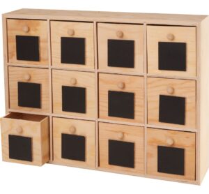 Die kleine Kommode ist aus Kiefernsperrholz gefertigt. Die 12 Schubladen sind je ca. 6,5 cm breit, 6 cm tief und 6,2 cm hoch. Die Fronten der Schubfächer ist mit einer Tafelfläche ca. 4,5 x 4,5 cm ausgestattet – perfekt zum Ordnung schaffen! Die Holzkommode ist gesamt 24 cm breit, 7 cm tief und 31,5 cm hoch. Sie lässt sich individuell mit Farbe und den verschiedensten Basteltechniken gestalten: Schabloniertechnik, décopatch, Serviettentechnik und mehr. Tiefe: 7 cm Breite: 31.5 cm Höhe: 24 cm Material: Sperrholz