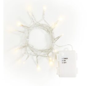 Unsere VBS Outdoor Mini Lichterkette mit Timer und transparentem Kabel verfügt über ein speziell geschütztes Batteriefach welches über einen integrierten Timer die Lämpchen 6 Stunden leuchten und 18 Stunden ruhen lässt. Die LED Lämpchen leuchten warmweiß. Benötigt werden 3 Stück AA Batterien. Diese sind im Lieferumfang nicht enthalten. Mit dieser tollen Lichterkette lassen sich ganz unkompliziert im Garten Sträucher, Büsche und kleine Bäume zum Leuchten bringen. In der Vorweihnachtszeit zaubert das Licht eine besonders schöne Stimmung in Ihren Garten oder den Balkon. Anzahl Lampen: 20 Schalter Länge: 2.4 m Material: Kunststoff