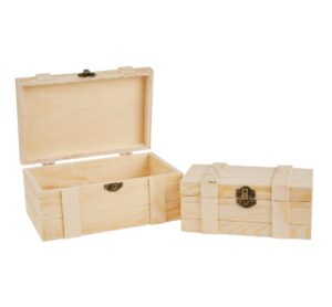 Tolles VBS Schatztruhen 2er-Set aus Holz, hochwertig verarbeitet. Die Größe der beiden Truhen ist ca. Länge 20 cm x Breite 13,5 cm x Höhe 8,5 cm und Länge 17 cm x Breite 9,5 cm x Höhe 7,2 cm. Die Kästchen haben einen erstklassigen Metallverschluss und sind aus Kiefernsperrholz. Mit diesem schönen 2er Set werden Wünsche war. Exzellent geeignet für die Gestaltung mit Acrylfarben, Serviettentechnik, Motivstrohseide, Dècopage-Technik oder ganz einfach für das Bemalen mit Handlettering. So können die Truhen zu Einzelstücken werden, welche auch eine hübsche Geschenkidee sind. Die Kästchen sind ein wundervoller Blickfang und eine großartige Aufbewahrungsidee, zum Beispiel für Schmuck und andere Kleinigkeiten. So können die Truhen dem Wohnstil angepasst werden und die Möglichkeiten der Dekoration sind sehr vielfältig. Ob im Landhausstil, Modern oder mit viel Glitter und Glitzer! Erlaubt ist was gefällt! Größe: 17 – 20 cm Inhalt: 2 Stück Material: Sperrholz