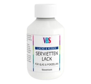 Du möchtest deine Lieblingsserviette auf Glas oder Porzellan aufbringen? Dann ist dieser VBS Servietten-Lack „“Glas & Porzellan““ hervorragend geeignet. Es handelt sich um Serviettenlack und Kleber in einem Produkt. Der Inhalt beträgt 100 ml. Mithilfe des Schraubdeckels lässt sich die Flasche fest verschließen, um ein Austrocknen zu verhindern. Speziell zum Arbeiten auf Glas und Porzellan. Nach dem Auftragen mit dem Serviettenpinsel muss der Lack bei 160 °C ca. 30 Minuten eingebrannt werden. Anschließend ist das Objekt abwischbar. Tassen, Gläser, Blumenvasen, Geschirr, Teelichtgläser, Windlichter und vieles mehr können nach eigenen Vorstellungen verziert werden. Wähle zwischen deinen Lieblingsmotiven und kombiniere sie zu tollen Unikaten. Füllmenge: 100 ml