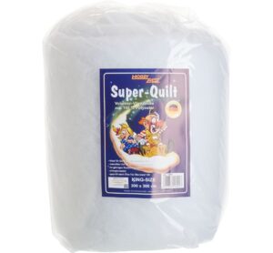 Das Volumenvlies „“Super Quilt““, King -Size ist ca. 10 mm stark und wird vor allem als wattierte Verstärkung unter Stoff genäht, für Nähprojekte wie Krabbeldecken, für Patchwork-Arbeiten oder für das Quilten. Mit einer Breite und Länge von ca 300 cm ist dieser Vlies ideal auch für größere Näharbeiten. Die hervorragende Qualität des Vlies Stoffes sorgt für ein langlebiges Bauschverhalten, das Volumenvlies ist waschbar bis 40°C. Es ist somit die optimale Grundlage für viele Handarbeitsideen. Grammatur: 80 g/m² Länge: 300 cm Breite: 300 cm Stärke: 10 mm