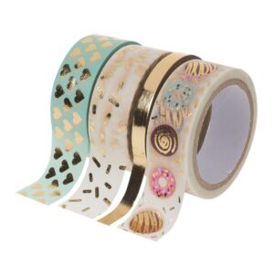 Das Washi Tape Set „“Hot Foil““ ist ein hübsches Set bestehend aus 4 bezaubernden Tape-Rollen in Mint / Gold mit einer Heißfolienveredelung. Alle Rollen haben eine Länge von 5 Metern. Die Breite beträgt 3 x 15 mm und 1 x 5 mm. Es handelt sich hierbei um ein selbstklebendes Motiv-Band aus Papier. Bedruckt mit kleinen Herzen, Strichen und Punkten eignen sich diese Bänder super für Planer und Kalender. Ein origineller Hingucker mit goldenen Akzenten. Die Motivbänder können super miteinander kombiniert werden. So entsteht immer wieder ein neuer Look, der durch Sticker und Handlettering verziert werden kann. So wird aus einer einfachen Karte schnell ein persönlicher Gruß im modernen Stil. Selbstklebend Inhalt: 4 Stück Länge: 5 m Material: Papier